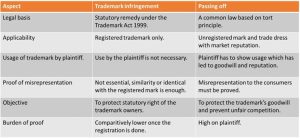 Registered marks can be enforced through infringement actions. Unregistered marks can be enforced only through passing off, where the plaintiff must prove use, goodwill, and deception. The difference between them is laid out in the table below-